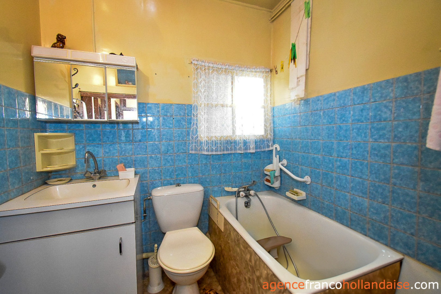The house, facing southeast/northwest, is typical of the centuries-old buildings of southern Limousin and northern Dordogne, and has a beautiful exterior character that simply needs updating inside. The main entrance is located on the southeast facade, opening onto a central entrance hall with an open staircase leading to the upper floor. To the right of the entrance is a tiled kitchen with built-in cupboards, an open fireplace, and a wood range cooker. A non-load-bearing partition separates it from the utility room, which faces northwest and has a secondary entrance with a glass porch leading to the rear garden. To the left of the utility room is a small bathroom with a toilet. To the left of the entrance, the double aspect dining room with a full-height, solid-framed cupboard is situated above the cellar, which occupies part of the house's footprint.