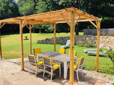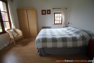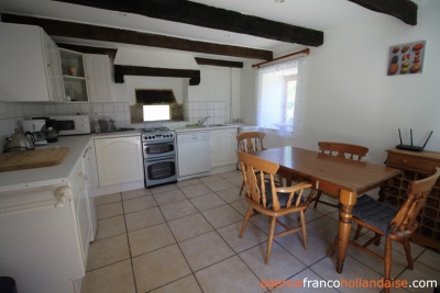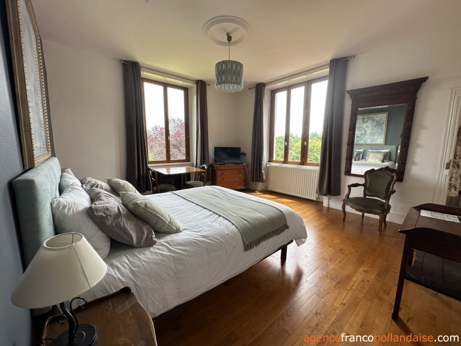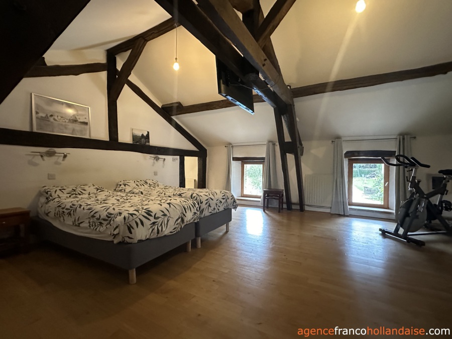 The buildings, accessible via a private driveway, surround the central courtyard. The main building, measuring approximately 328 m², has two entrances: one for the owners’ accommodation and one for the bed & breakfast guests. There is a large open-plan kitchen, dining and living room with a wood-burning stove and oak flooring. A staircase leads to the owners’ bedroom with an en-suite bathroom and a dressing room (or second bedroom). A practical laundry room is also located on this side.
