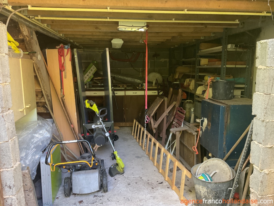 The main house of approximately 95 m² has a modern kitchen on the ground floor. With its stone walls, wooden beams and partly wooden and partly tiled floor, it’s a very French charming space. Next to it is a utility room and toilet. On the other side of the stone wall is the cosy living room with the stairs and a soapstone wood-burner. Upstairs, there is a bedroom with a French balcony and plenty of storage space covering the entire (wooden) floor area. Next to it is the bathroom with a walk-in shower and toilet. Much of the interior can be left behind.