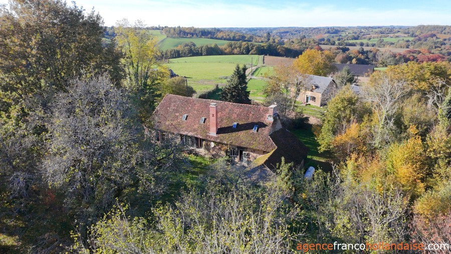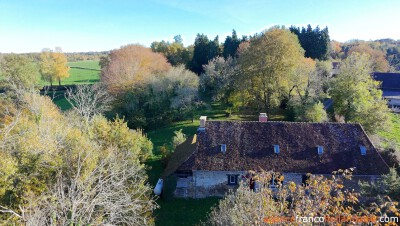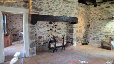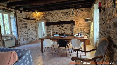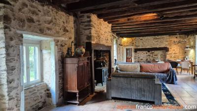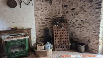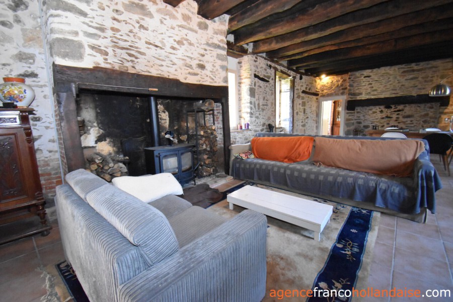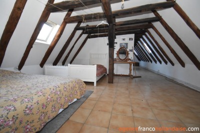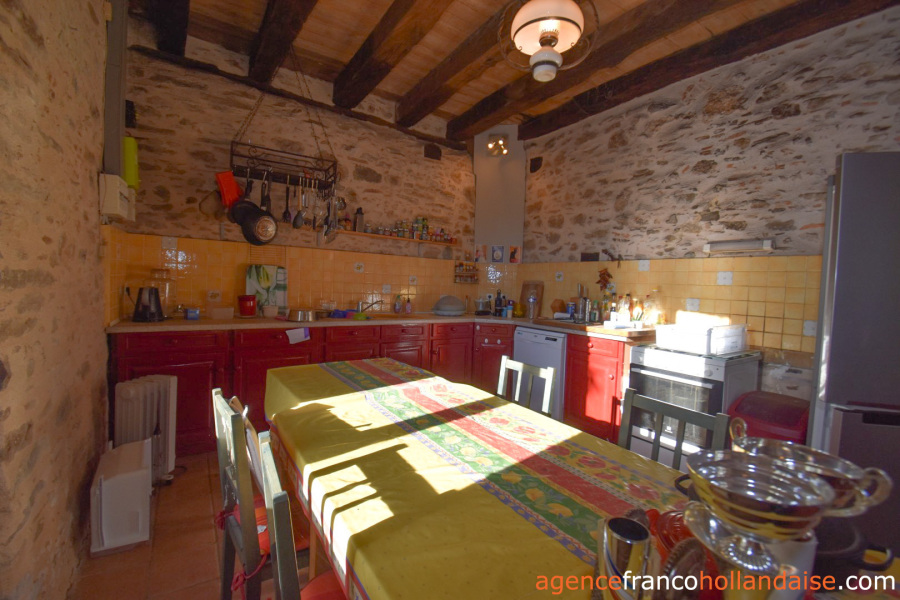 Old beamed ceilings, stone walls and many original details reveal the year of construction, 1742, in this charming maison de campagne, which is almost 20 metres long and 5.50 metres wide. You enter the house through a beautiful antique castle door. From the hall with toilet, you reach the long living room with two fireplaces, one of which has a wood-burner to heat the house. The adjacent kitchen is fully equipped and large enough for a dining table. If you replace a window for a door, you will have direct access to the garden.