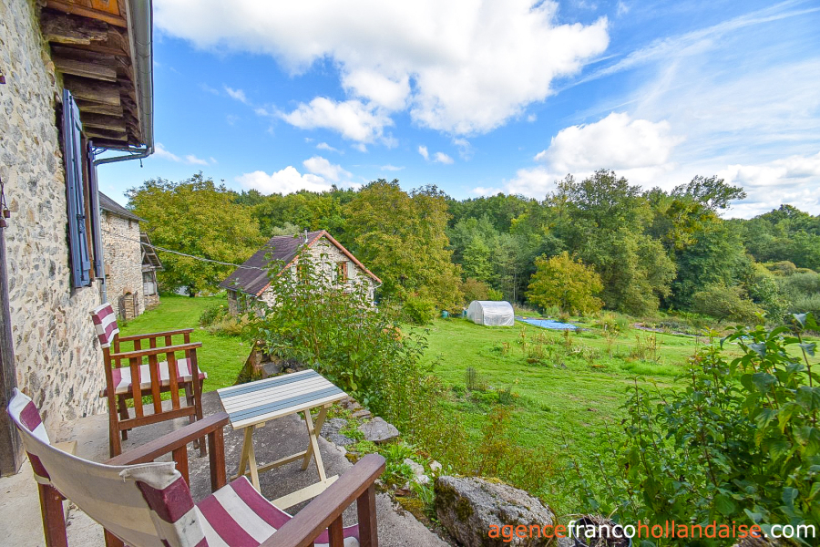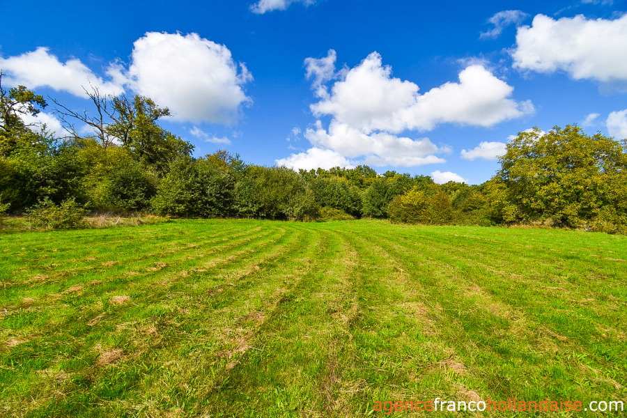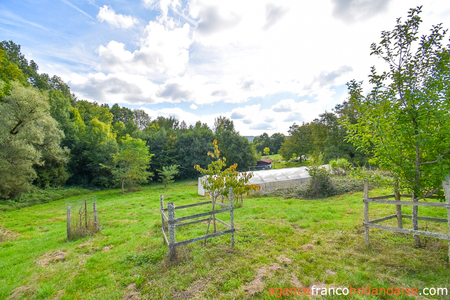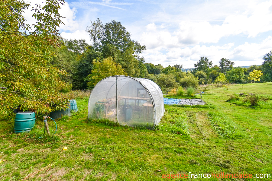 On the property, you have a well-organized ca. 15 acre plot of land, fully fenced and with a variety on offer, since it incorporates a wooded area with all types of hardwood species where an underground spring flows into a natural pond, a large part in pasture and a market garden area close to the buildings with a large, longitudinal greenhouse so you may have vegetables all year round. The land is not flat, but on a reasonable slope and the view from the buildings over the surrounding hilly and wooded countryside is magnificent. The immediate impression upon your arrival will be positive, we guarantee it! Arriving at the property, you notice a neighbour on the other side of the road, then you quickly forget about him because he is invisible as soon as you are on your own land.