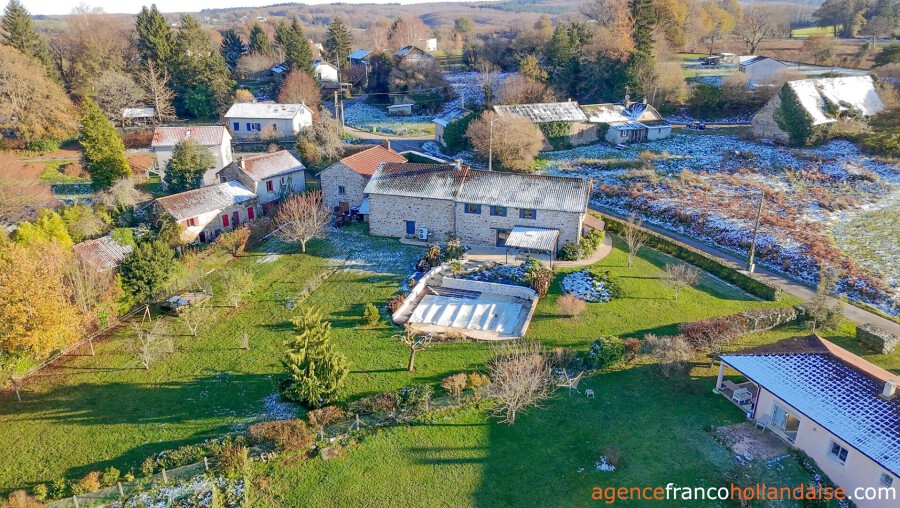 This beautiful barn, converted in the early 2000’s, is located on a hillside amidst its landscaped grounds of over 2,500m² (over ½ acre), in a hamlet on the heights of a small village with amenities and a swimming lake in the southeastern part of Haute-Vienne County. A large living space was created from a farm building to turn it into a high-quality family home. Further development potential remains, with the former house and its decent convertible space, as well as a storage area with a second adjoining barn. Additional small outbuildings, a bread oven and a canopied terrace area with an in-ground pool form part of this charming property, where you can immediately settle down and enjoy country life for many years to come.