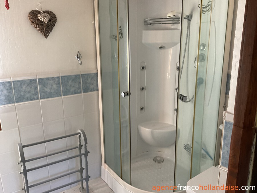 Upstairs is the gîte, consisting of a living room with kitchen, bathroom, bedroom and balcony/terrace.