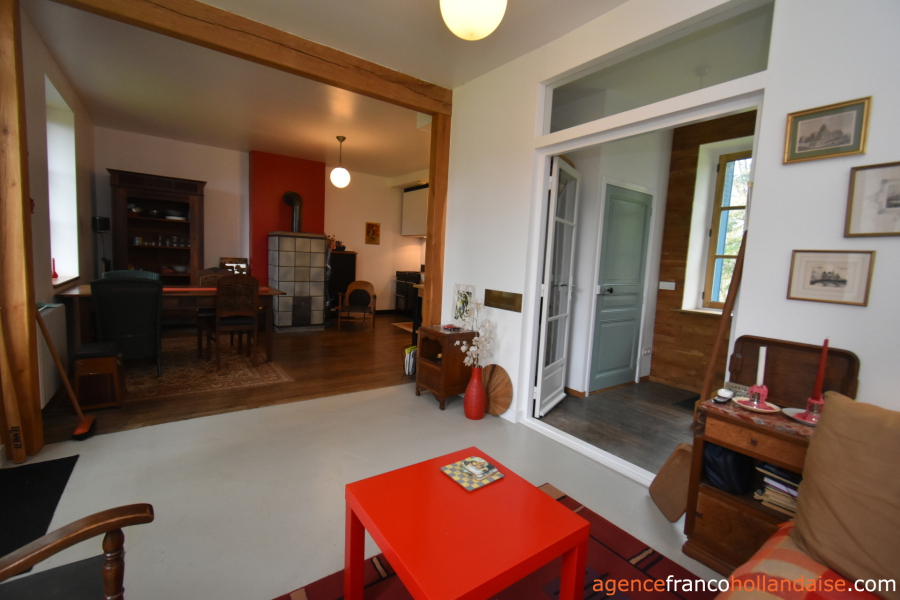 The house has been fully renovated in recent years, retaining authentic and charming features such as the wooden doors and windows. On the ground floor is the L-shaped living area of approximately 320 ft² with a kitchen unit, dining area and sitting area. Between the dining area and the kitchen stands a large Finnish wood-burning stove that heats the room well. In the hallway there is a toilet and the stairs leading to the basement and to the first floor. On the first floor there are two bedrooms with a dormer window, a spacious landing and a bathroom with a toilet, shower and washbasin. The bathroom is also accessible from the master bedroom.
