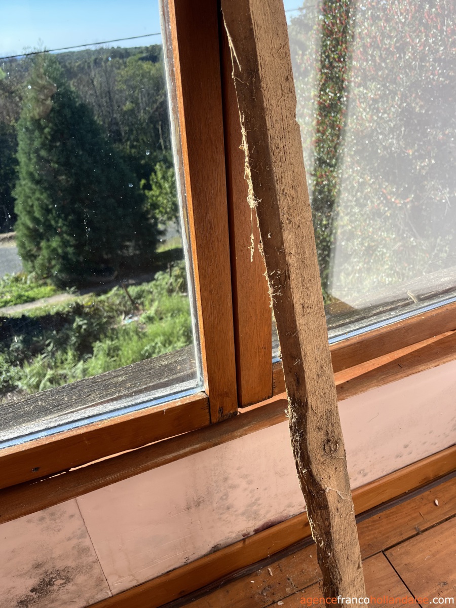 The two closed stairwells provide access to the basement and the 1st floor. There is solid pine flooring throughout this floor. The staircase runs up to a landing (ca. 26 Sqft ) with built-in cupboards, Velux and “bull’s eye” windows opening onto a first bedroom (ca. 200 Sqft) with a large “dormer” window. Then a second landing (ca. 43 Sqft) with a French door above the ground floor veranda, gives access to a second bedroom (ca. 215 Sqft), also with a large “dormer” and a heat distribution vent coming from the living room log burner. Finally, a passageway leads to a rustic-looking bathroom with a toilet (ca. 70 Sqft) and to a third bedroom (ca. 161 Sqft) with “dormer” and “bull’s eye” windows. The view from the three bedrooms is very beautiful as it overlooks the valley, a real treat!